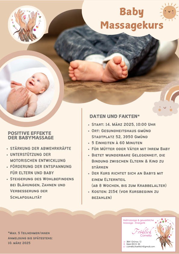 Ab 15. März 2025 startet im Gesundheitshaus Gmünd ein Babymassagekurs für Mütter oder Väter mit ihrem Baby.
